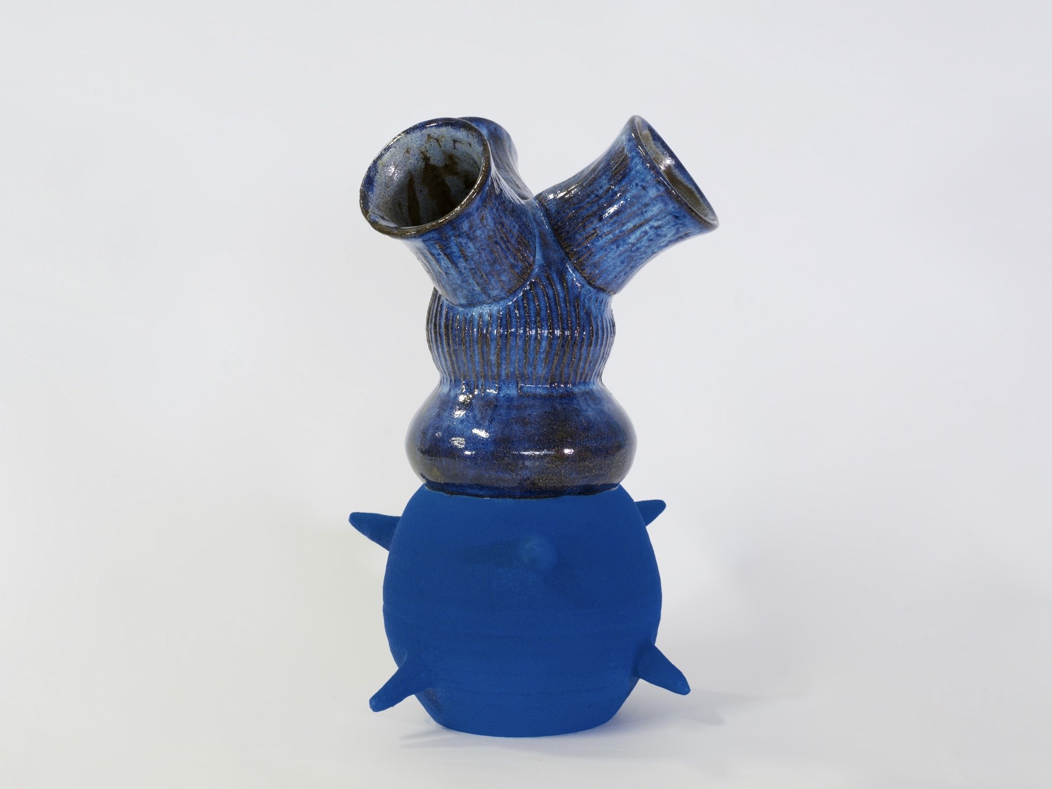 The ceramicist uses a number of painting techniques – brushing, spraying, drizzling – but a bulb syringe is responsible for his lavish drippings of paint, a recurring motif reminiscent of candle wax and libations splattered on ritual altars in Voudou. Some glazes crackle, promising undiscovered treasure. Some areas are treacly thick with tint, while others leave the clay naked and vulnerable. Teasing at biomimicry, spikes borrow their form from the natural world. Like thorns, they protect the vessel, allowing it to hold some of its beauty for itself.