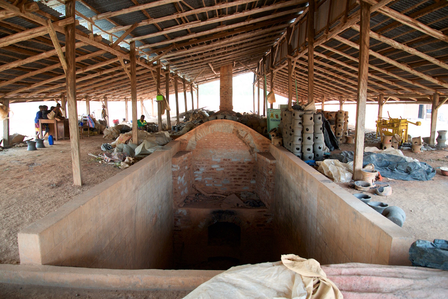 Une fois passé le portail d’entrée du centre, je suis saisi par une vaste charpente abritant un four en brique qui occupe, à vue d’œil, près d’un quart de la cour principale. Ce n’est pas commun pour un centre de poterie béninois en zone rurale. Je m’étonne donc : les potières Assoukagboffi cuiraient-elles leurs poteries « à l’occidentale », dans un four en briques réfractaires plutôt que dans un foyer en plein air ?